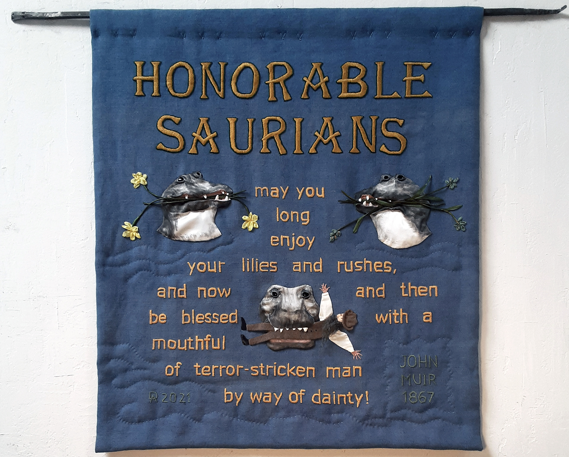 Hand embroidery & applique. Linen, cotton, silk, wool, onyx. 32" x 28" And hand-forged iron 40". Dianne Ayres 2021